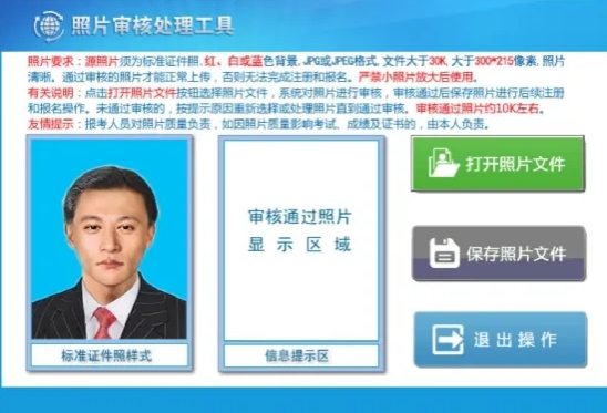 (2)請考生提前準備源文件為標準證件數字照片,格式為JPG或JPEG,紅色、白色或藍色背景,源文件大于30K,像素大于300*215的個人證件照片。并仔細閱讀照片要求及有關說明,點擊下載“照片審核處理工具”,解壓后點擊“照片審核處理工具.exe”。